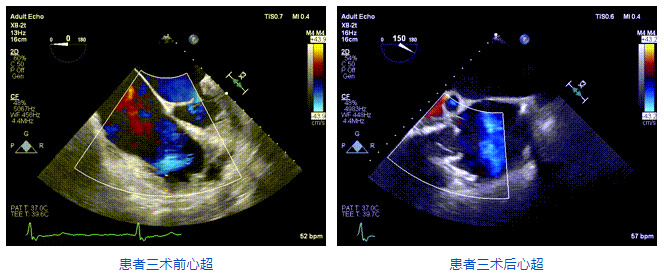 三例患者入院后,葛均波院士團(tuán)隊周達(dá)新教授、潘文志教授、張源博士、陳莎莎博士及心超室的潘翠珍教授、李偉教授對患者的情況進(jìn)行詳細(xì)評估和討論,最終決定為三例患者選擇LuX-Valve Plus40mm、50mm和50mm型號的瓣膜進(jìn)行手術(shù)治療。手術(shù)后即刻拔除氣管插管,術(shù)后患者三尖瓣反流癥狀得到顯著改善,復(fù)查心超結(jié)果顯示人工三尖瓣瓣膜支架固定穩(wěn)定,瓣葉關(guān)閉形態(tài)未見異常,未見明顯反流。