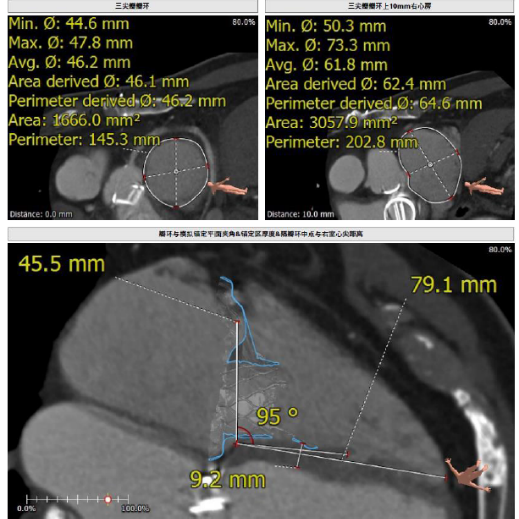 接受本次治療的是一例三尖瓣重度反流的患者,NYHA心功能Ⅲ級(jí)。主訴“反復(fù)活動(dòng)后氣促1年,下肢水腫4個(gè)月”。入院N末端B型腦鈉肽前體(NT-proBNP)3161pg/ml。心電圖提示:心房顫動(dòng),ST-T改變。術(shù)前超聲提示:重度三尖瓣關(guān)閉不全,右心房擴(kuò)大,三尖瓣收縮期位移(TAPSE)14mm,左房增大,左室收縮功能正常低值,主動(dòng)脈瓣、二尖瓣機(jī)械瓣功能良好。術(shù)前CT評(píng)估(圖1):三尖瓣瓣環(huán)(周長(zhǎng)換算直徑)大小為46.2mm;入路血管無(wú)嚴(yán)重迂曲,無(wú)鈣化;雙側(cè)冠脈有鈣化。