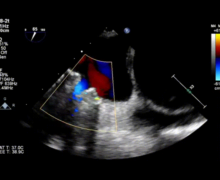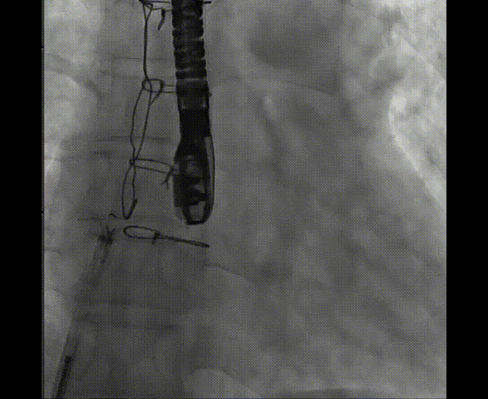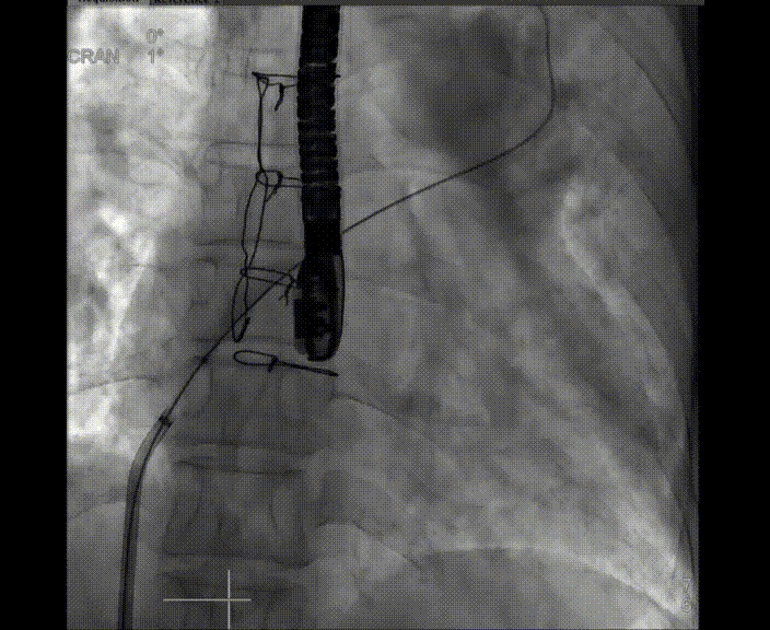術(shù)中首先在局麻下穿刺股動脈、股靜脈,完成心導(dǎo)管檢查評估后轉(zhuǎn)為全麻,在食道超聲引導(dǎo)下穿刺房間隔,穿刺成功后將加硬導(dǎo)絲送入左上肺靜脈建立軌道,根據(jù)患者病情行球囊預(yù)擴(kuò)張后植入6mm孔徑房間隔造孔支架,經(jīng)透視及食道超聲評估支架左右盤展開良好,夾持于房間隔兩側(cè),固定穩(wěn)定、位置良好,食道彩超顯示房水平右向左為主分流,分流孔直徑符合預(yù)期大小,心導(dǎo)管檢查評估達(dá)到預(yù)期效果,釋放造孔支架。術(shù)后12h患者下床活動,恢復(fù)順利,擬于近日完善術(shù)后評估后出院。
